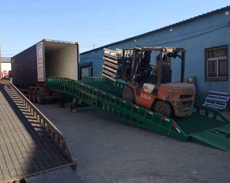 三、進(jìn)行登車作業(yè)前,應(yīng)先檢查登車橋各部位有無異常。再將登車橋置于空闊、安全的場所,和相應(yīng)需裝卸的貨柜、車進(jìn)行安全對(duì)接好以后,在貨車車輪下方墊好安全三角木。
